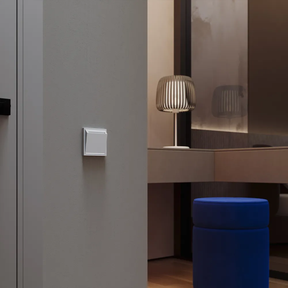 • Цвет серый — без бликов и следов — покрытие Soft touch создаёт бархатистую поверхность, которая не отражает свет от бра или окна и не собирает отпечатки пальцев. На светлых стенах визуально «растворяется», на тёмных — становится сдержанным акцентом без агрессии. Габариты 70,8 × 70,8 мм идеально вписываются в любую композицию серии S70.