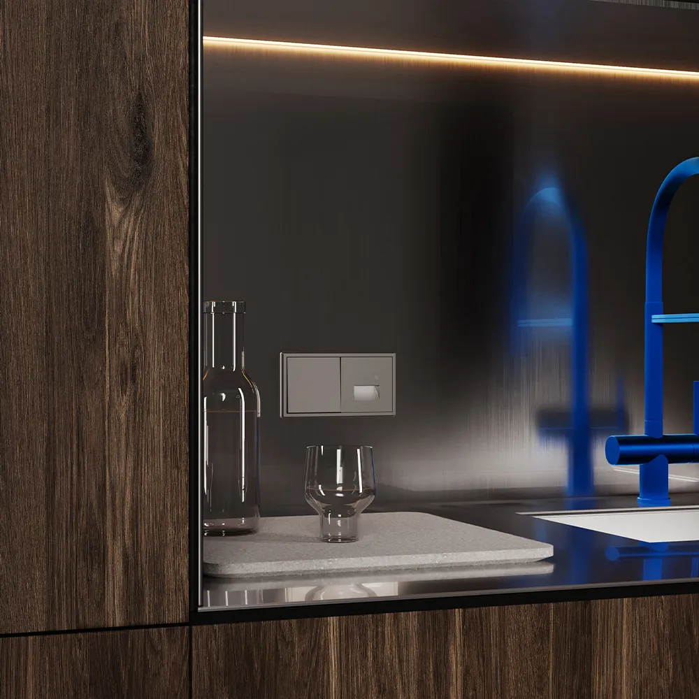 Выключатель полностью совместим с пластиковыми и стеклянными рамками той же серии и гармонично вписывается в любую композицию из розеток, выключателей и других устройств VOLTUM S70.